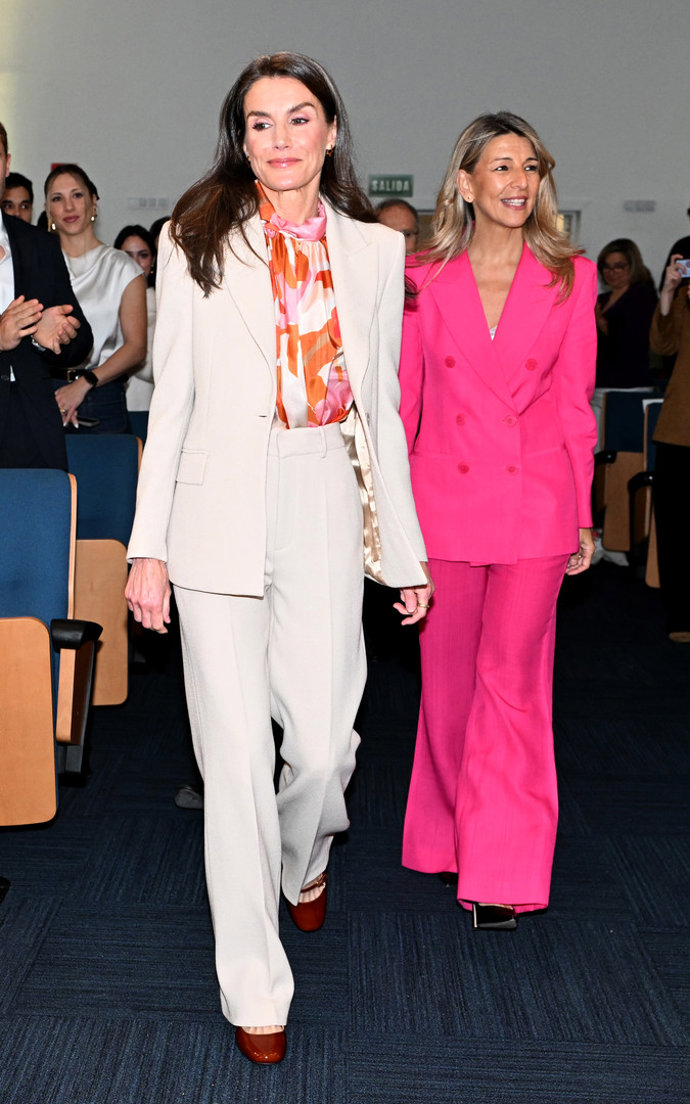 Un compromiso en el que la Reina ha llenado de luz el día gris con el que ha amanecido Madrid escogiendo un estilismo de estreno que es pura inspiración y grita primavera a raudales. Así, dando una nueva lección de elegancia en clave ‘work’, Doña Letizia ha lucido un traje sastre en color crema compuesto por blazer estructurada con solapas clásicas y cierre de un solo botón -aunque ha optado por llevarlo desabrochado- y pantalón de pinzas de corte amplio, y una preciosa blusa de seda en tonos vivos en rosa, naranja, y blanco con cuello envolvente.