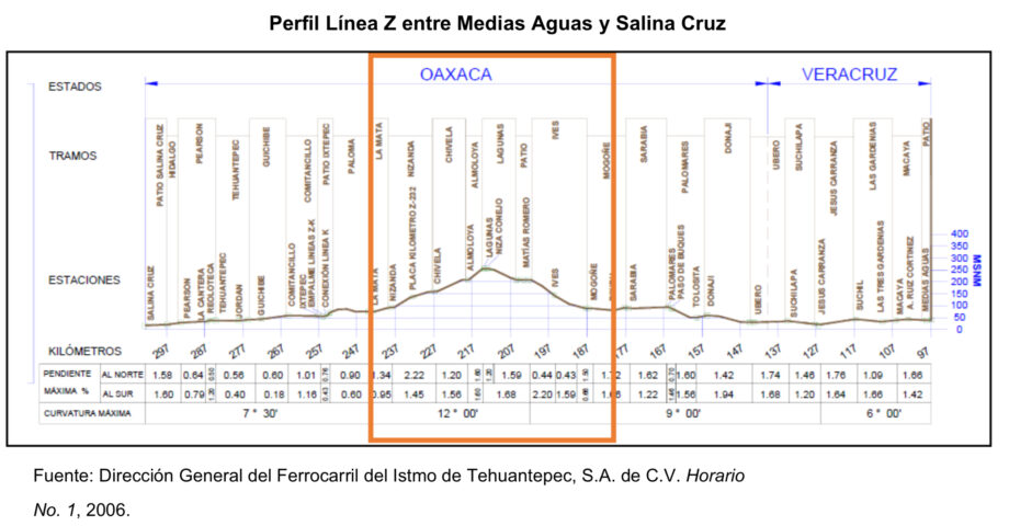 Diagrama sobre la pendiente y curvatura de la Línea Z, el principal tramo del Ferrocarril del Istmo de Tehuantepec, y que registró un accidente a finales de 2025 que dejó 14 muertos y 110 heridos en el sureño estado de Oaxaca. Imagen: CIIT