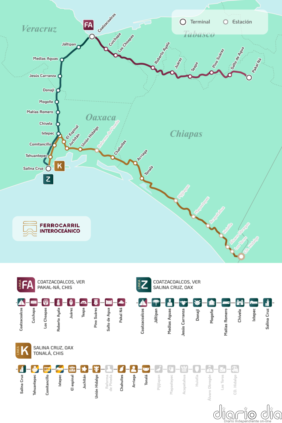 El Ferrocarril del Istmo de Tehuantepec recorre 29 estaciones a lo largo de unos 1000 kilómetros que interconectan las costas de los océanos Pacífico y Atlántico, por la parte más estrecha de México, en el sur del país. Imagen: FIT