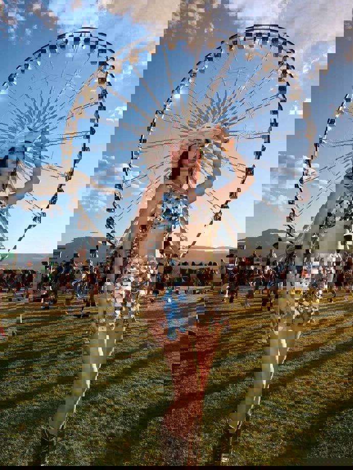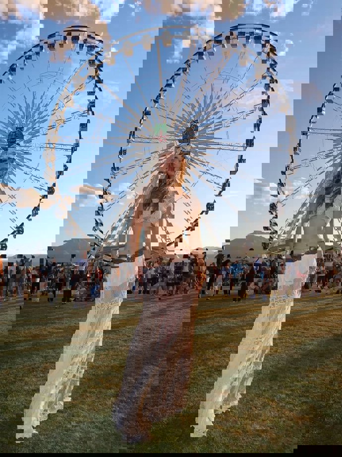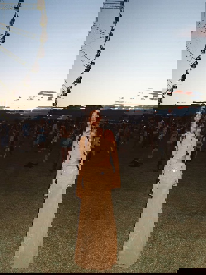 Los detalles —como el pañuelo al cuello con piedras y las botas— terminaron de construir un estilismo que mezclaba a la perfección la esencia del festival con su estilo personal.