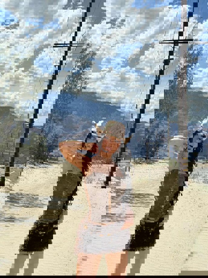 Carlota Melendi, por su parte, eligió una combinación de chaqueta y short de ante en color teja junto a un bikini blanco, reforzando una vez más la estética western tan presente en esta edición. Las botas cowboy estampadas y el sombrero crema completaron el look, demostrando que un estilismo sencillo puede ser perfecto con los accesorios adecuados.