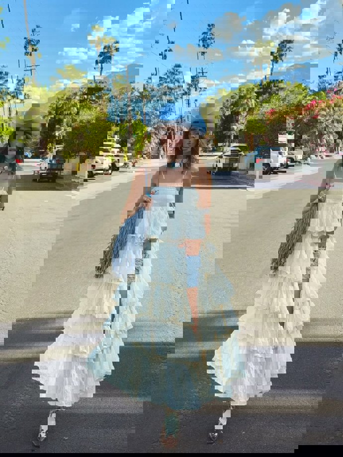 Lucía de Luis volvió a ser una de las más originales. Esta se mantuvo fiel al espíritu ‘boho chic’ -que sin duda es nuestro favorito- con un espectacular top largo de volantes que combinó con short de crochet en azul pastel y sutiles lentejuelas. Los accesorios en tonos suaves y el gran sombrero y botas estilo ‘country’ crean una propuesta inspirada en el imaginario romántico del festival.