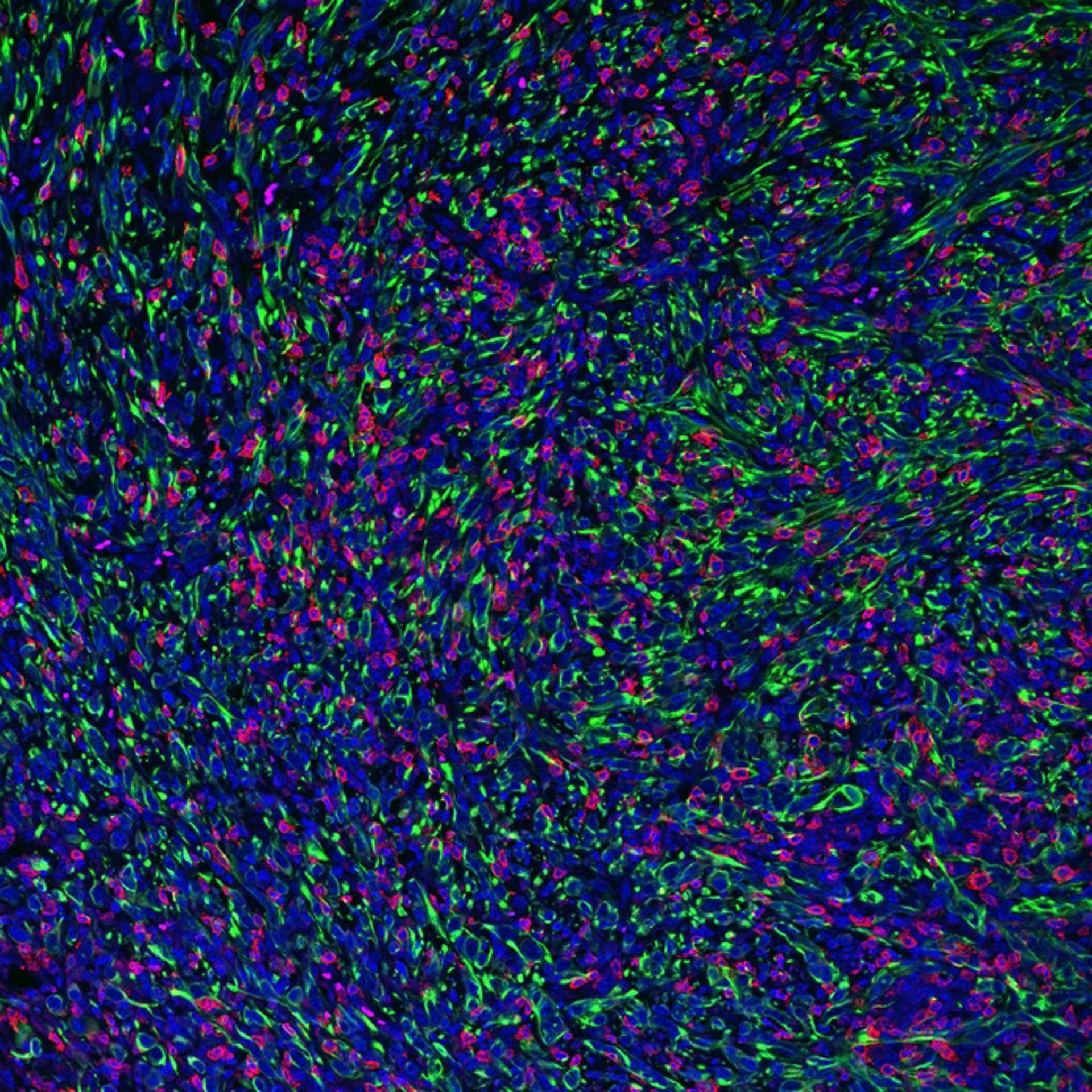 Archivo – Tumor con células cancerosas deficientes en FMRP (en verde) que son infiltradas y adheridas por células T asesinas (CD8).