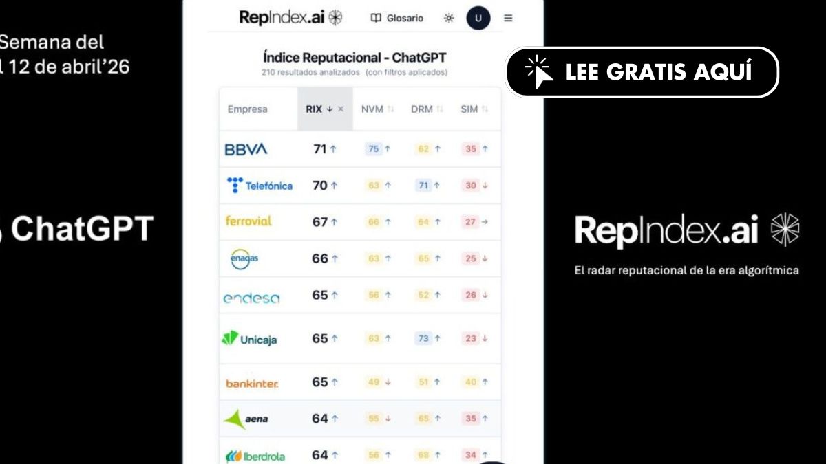 Bankinter, Enagás, Mapfre, Puig y Telefónica conforman el Top 5 de reputación corporativa algorítmica del Ibex 35 en ChatGPT durante el periodo 6 al 12 de abril, según el análisis semanal de RepIndex.ai. El ranking refleja un entorno en el que ChatGPT prioriza la consistencia narrativa, la calidad de las fuentes y la coherencia documental, consolidando un grupo de compañías con posicionamientos sólidos en el ecosistema algorítmico.