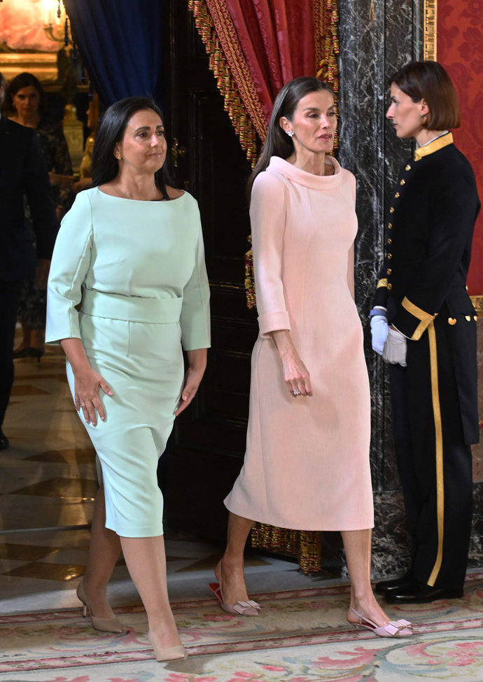 Una cita en la que la Reina ha recurrido a uno de sus colores favoritos para las grandes ocasiones, el rosa empolvado. Deslumbrante en su primera toma de contacto con Margarida Maldonado, la madre de la Princesa Leonor se ha convertido en la clara ganadora de su duelo de elegancia -y eso que la lusa ha estado a la altura de la ocasión con un favorecedor vestido en color aguamarina- con un diseño de estreno sencillamente perfecto.