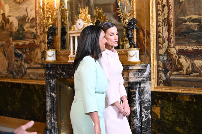 La Reina Letizia deslumbra con vestido rosa empolvado y pendientes vintage en su cita con la Primera Dama de Portugal