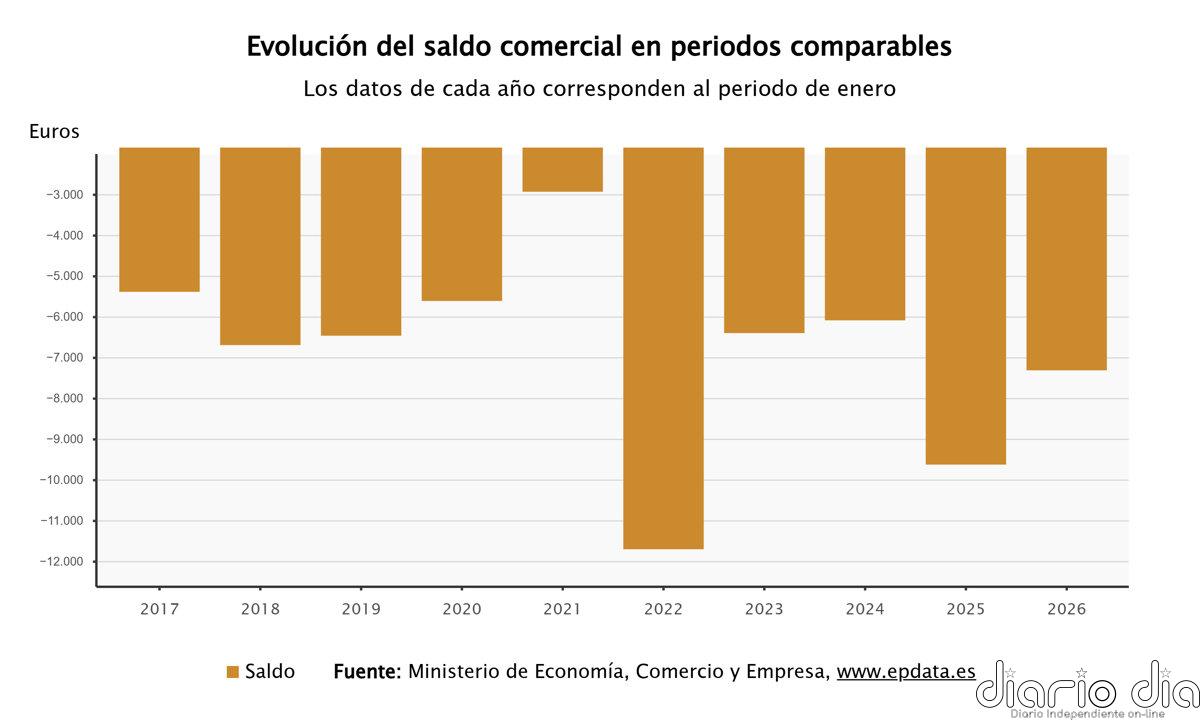 El déficit comercial se redujo un 24% interanual en los dos primeros meses del año, hasta los 7.306 millones de euros, debido principalmente al desplome, cercano al 34%, del déficit energético, que se situó en 4.116 millones de euros, coincidiendo con el inicio de la guerra en Oriente Próximo, según los datos publicados este martes por el Ministerio de Economía, Comercio y Empresa.