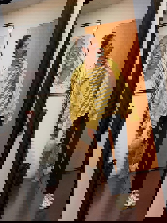 Camiseta, pantalón y chaqueta. Nada más. Un estilismo relajado, pero con matices interesantes que elevan el conjunto. Por un lado, la camiseta con cuello redondo presenta estampado a rayas blancas y amarillas; el pantalón, azul marino, es un básico de cualquier armario y la chaqueta… la chaqueta nos ha enamorado porque es tipo bomber, con manga abullonada, terminaciones en puño y maxisolapas. Como si de una parka corta se tratase.