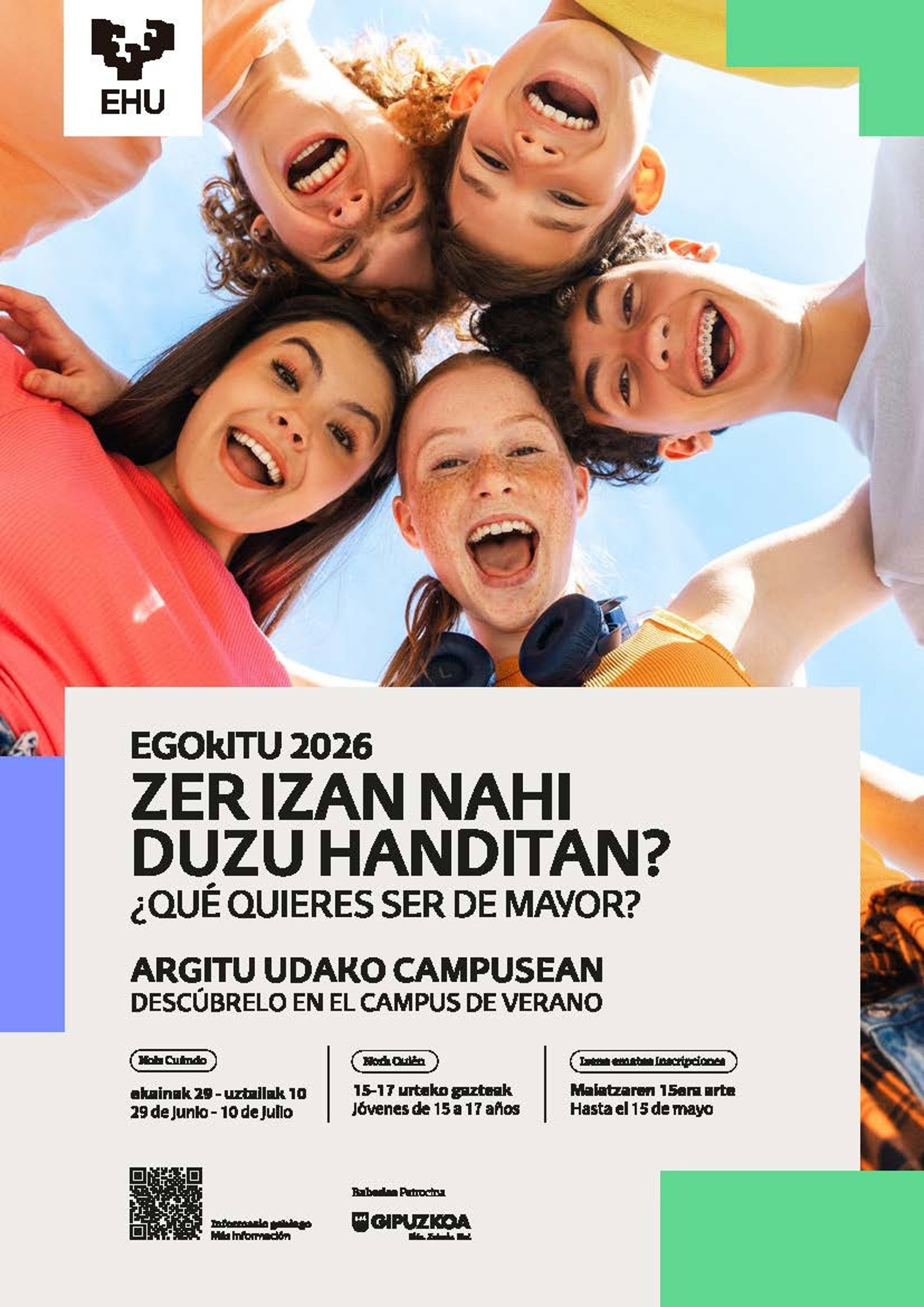 El programa EGOkITU está dirigido a personas nacidas entre los años 2009 y 2011. Se han organizado dos turnos: 29 de junio al 3 de julio y del 6 al 10 de julio del 2026. Se puede optar por elegir una semana o dos semanas, en horario de 09.30 a 14.00 horas (los comedores del campus permanecerán abiertos en las fechas en las que se desarrolle el programa). El plazo de inscripción está abierto y finalizará el 15 de mayo de 2026. Las plazas se adjudicarán por orden de inscripción.