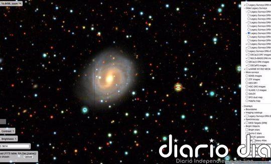 Una galaxia espiral, vista con la herramienta Sky Viewer en legacysurvey.Org/viewer. Sky Viewer utiliza datos del esfuerzo de mapeo 2D...