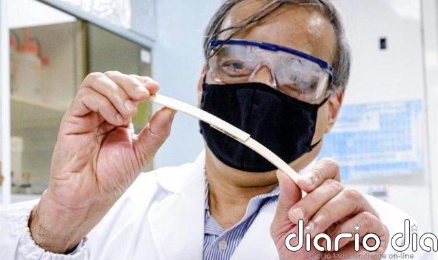 Un investigador de la NTU sujetando y doblando dos piezas de madera unidas en el medio por el pegamento de...