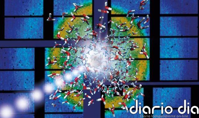 Los destellos de rayos X del europeo XFEL (violeta) no solo calientan el agua (moléculas rojas y blancas), sino que...
