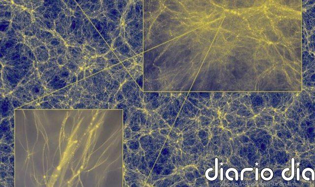 Mapa de densidad de materia oscura proyectado, creado mediante una simulación que mide 2.400 millones de años luz en cada...