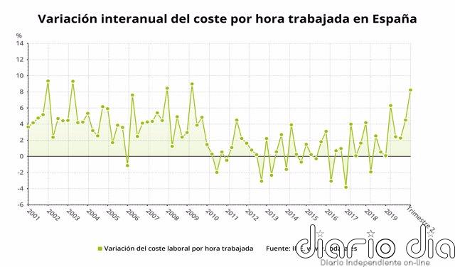 Variación interanual del coste por hora trabajada en España hasta el segundo trimestre de 2020 (INE, buena) - EPDATA MADRID,...